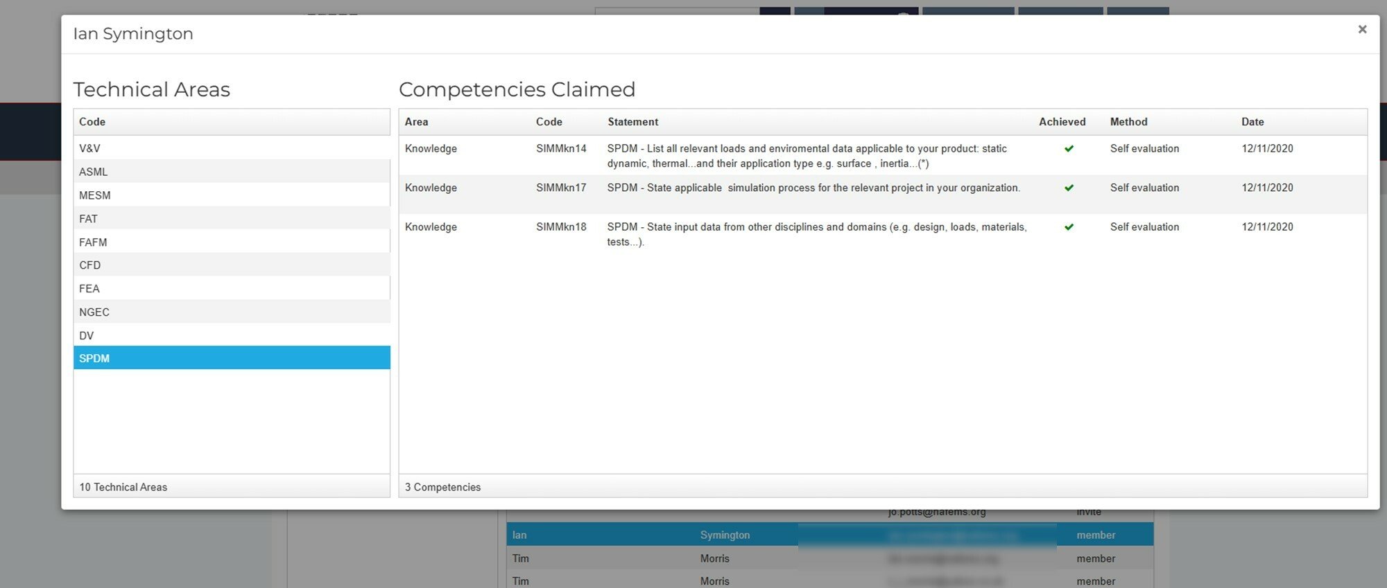 Selecting one of those Technical Areas will result in a listing in the lower box of the competencies related to that Technical Area, and which ones the individual has achieved: